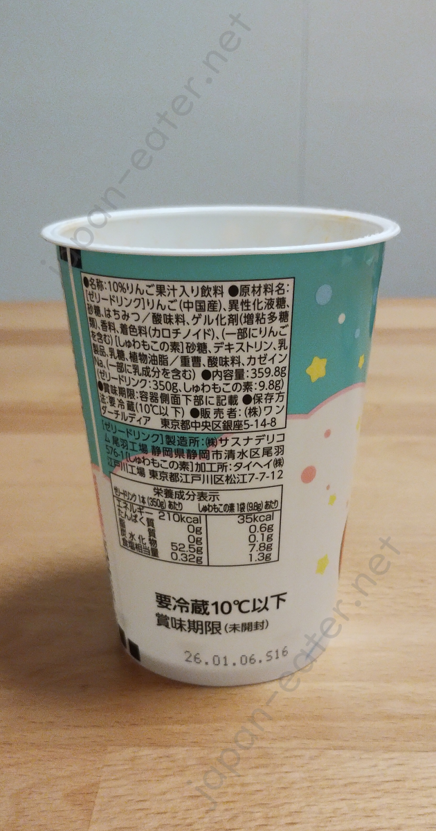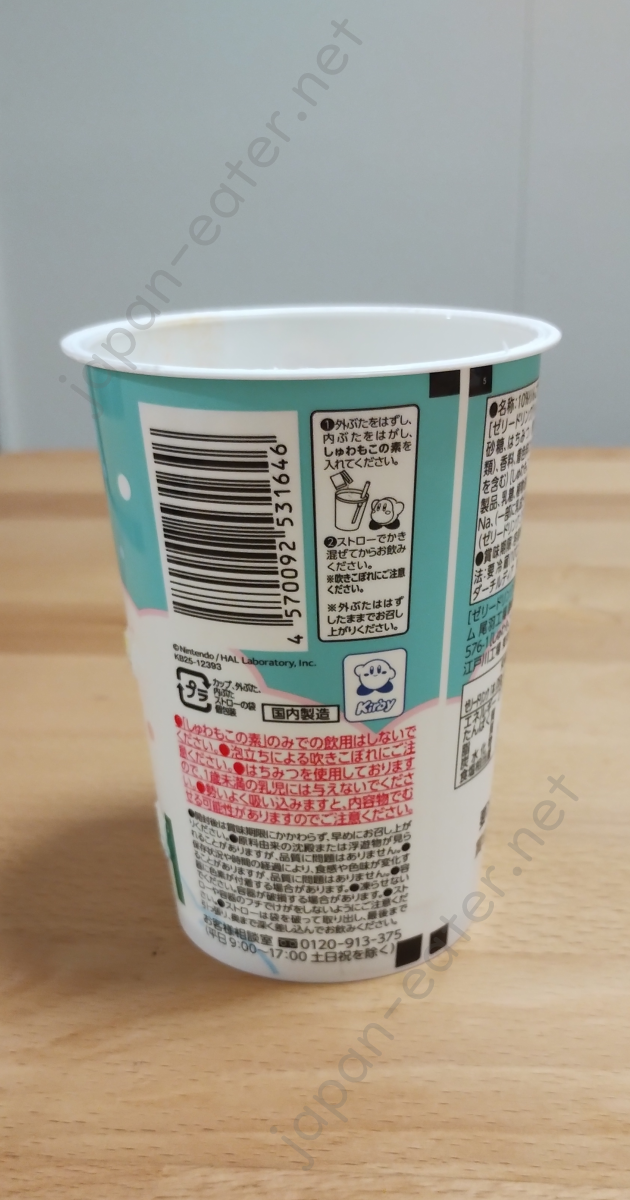 Unfortunately, the campaign recently ended. Even when I bought today's drink, the merch was already out of stock. Gotta be faster! However, we still get to try something special - an apple jelly drink! I think this is the first jelly drink we've reviewed. It might sound odd, but they are very popular and common drinks in Japan. This one comes with a topping, stored in the "bubbly fluff base" packet. As Waddle Dee cutely demonstrates on the cup, all you need to do is pour the powder from the packet on top, give it a good stir, and voila!